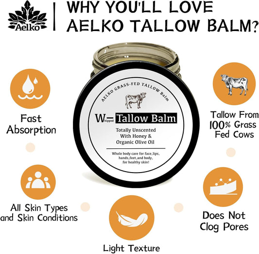 Beef Tallow Skincare, Whipped Tallow Balm,Tallow and Honey Balm for Soft, Smooth Face Skin, Natural Organic Moisturizer Cream - 60G/2Oz (Unscented)